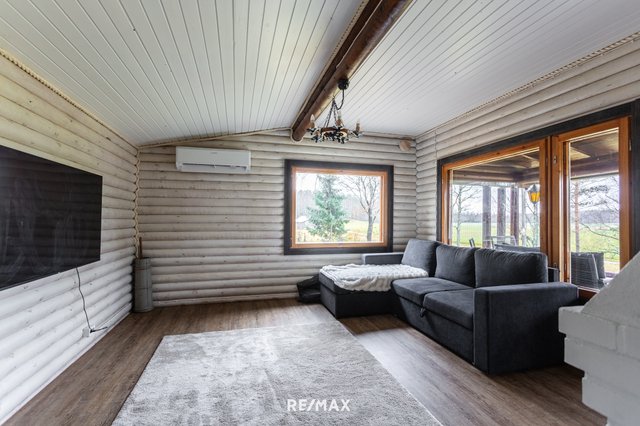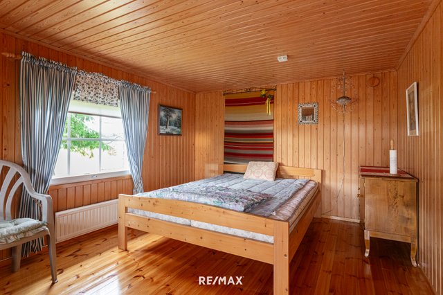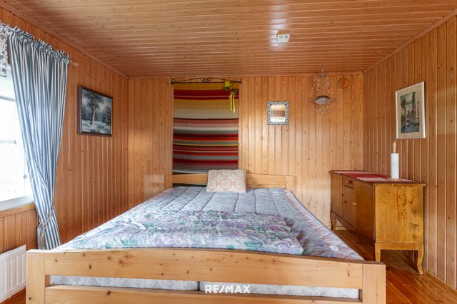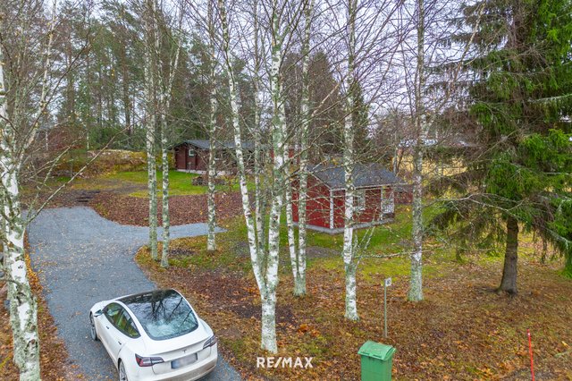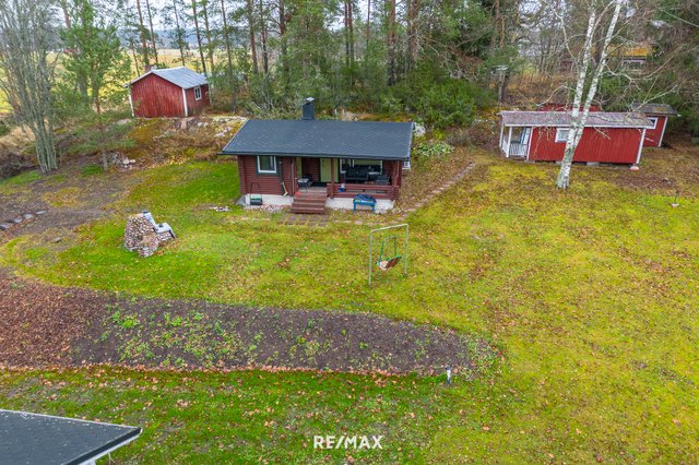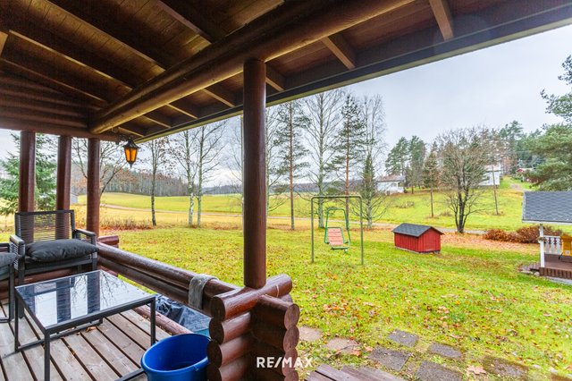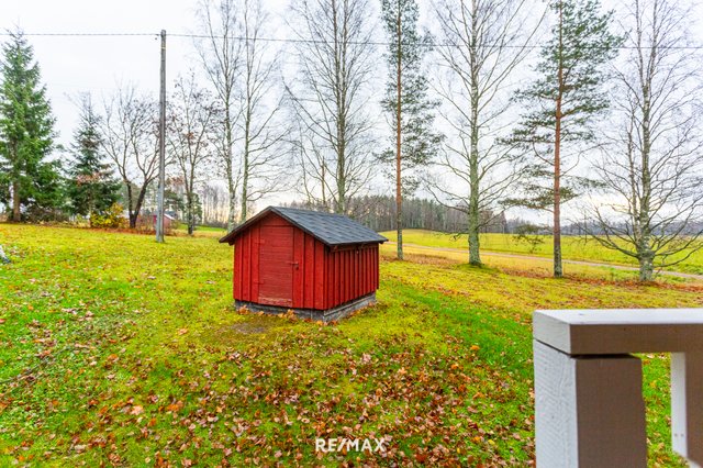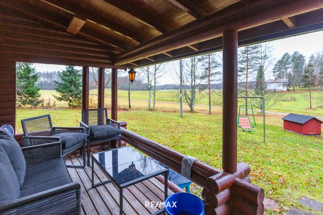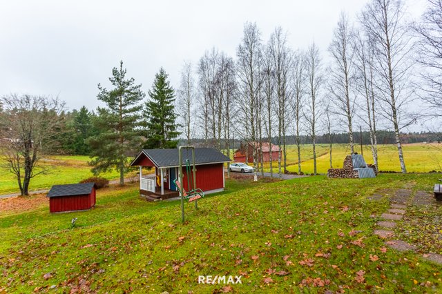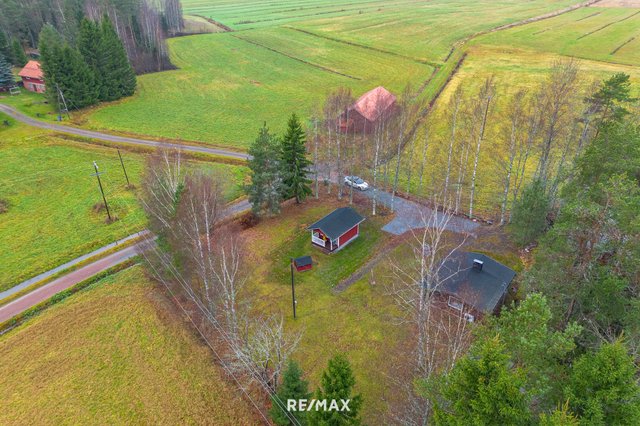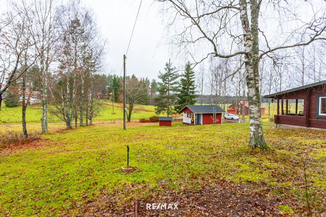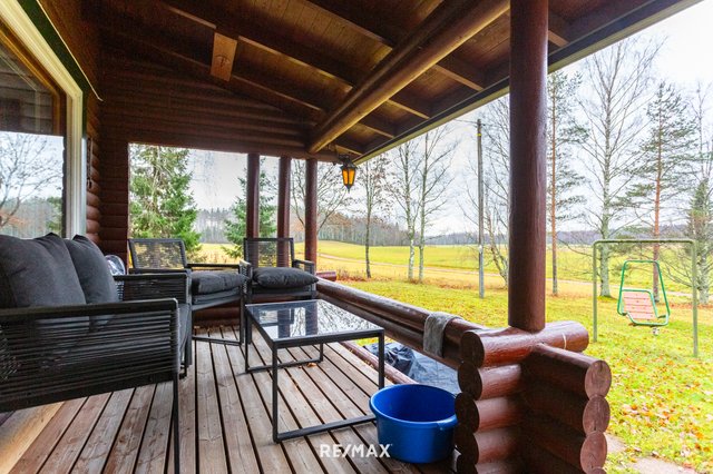 Pihapiiri on ihastuttava. Vehreä nurmialue laskeutuu lempeästi ympäröivään maisemaan, ja katettu terassi tarjoaa täydellisen paikan aamukahville tai kesäillan grillailulle. Lisäksi tontilla on sähköistetty vierasmaja, varasto sekä puucee ja liiteri, jotka lisäävät käytännöllisyyttä ja tarjoavat säilytystilaa.