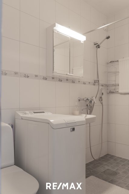 - WC-istuin, pesukoneliitäntä, peilikaappi, pesuallas, ja bidee-suihku