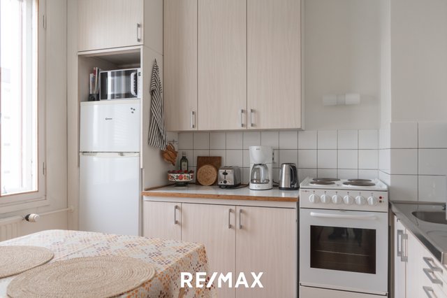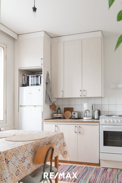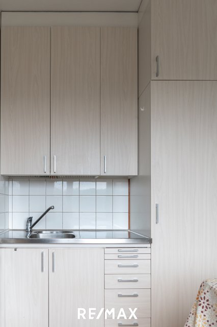 Keittiö on varusteltu peruslaitteilla, ja kylpyhuoneessa on liitäntä pesukoneelle, mikä tekee arjesta sujuvaa.