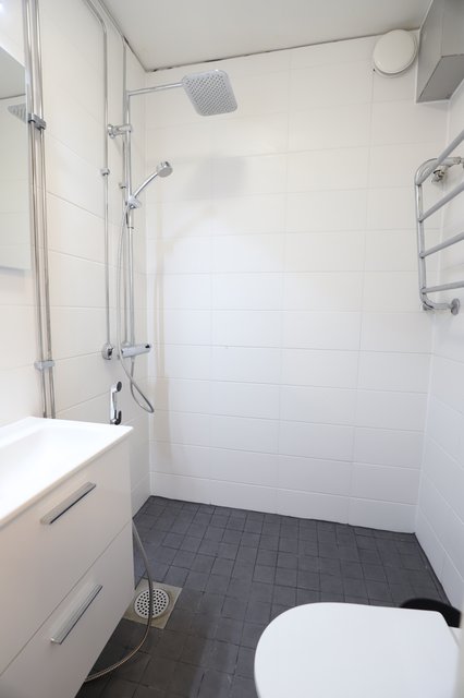 - WC-istuin, suihku, pesukoneliitäntä, peili, pesuallas, allaskaappi, bidee-suihku, ja lattialämmitys