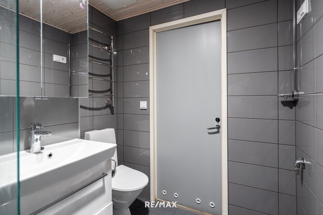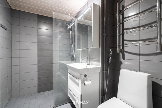 - WC-istuin, suihku, suihkuseinä, allaskaappi, peilikaappi, pesuallas, lattialämmitys, ja pesukoneliitäntä