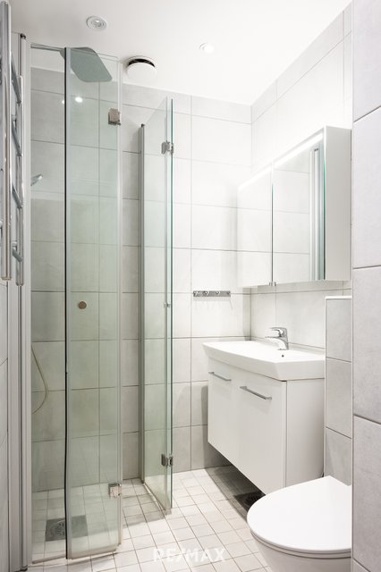 - WC-istuin, suihku, suihkuseinä, pesuallas, allaskaappi, ja peilikaappi