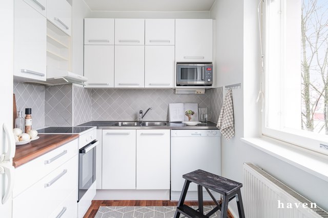 - Keittiöön tuo lisävaloa suuri ikkuna. Induktio liesi, jää- pakastinkaappi, apk, liesituuletin.
