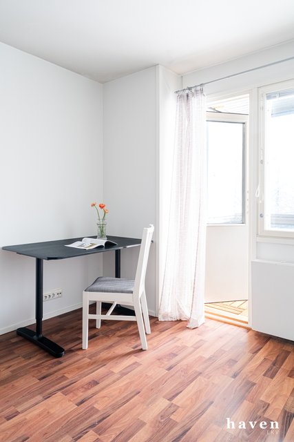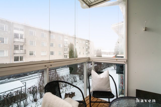 - Tilavasta olohuonneesta käynti lasitetulle, länteen avautuvalle parvekkeelle.