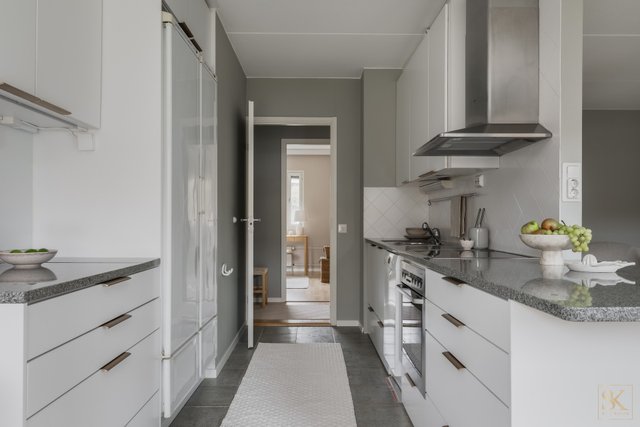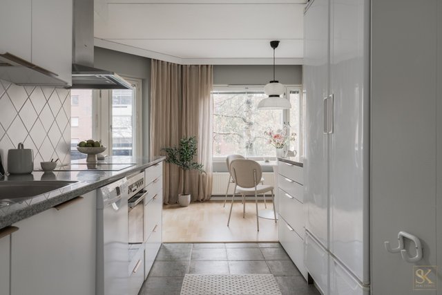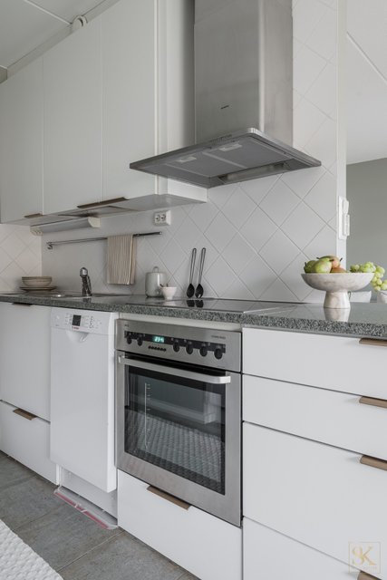 - VARUSTUS: Kaapistot, jääkaappi, pakastin, keraaminen liesi, erillisuuni, liesituuletin (suodatin), astianpesukone, pesuallas, hana. SEINÄT: Maalattu, kaakeli. LATTIA: Laatta. TYÖTASO: Kivi.