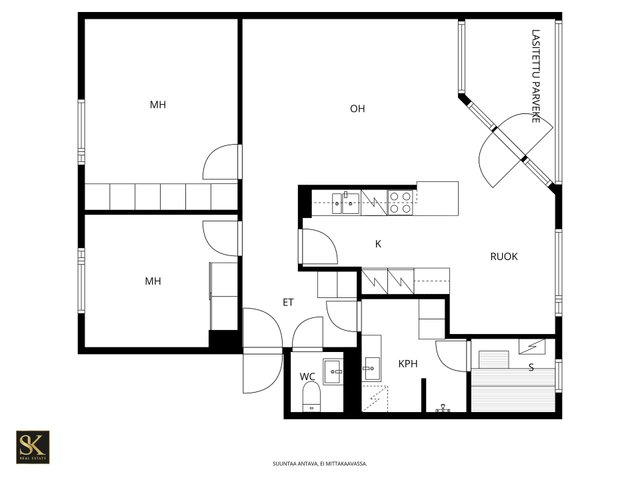 Virallinen huoneistoselitelmä yhtiöjärjestyksen mukaan 3h+k+s.