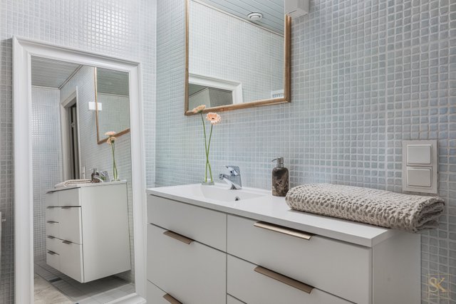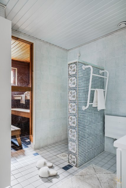 - Kylpyhuoneen kalusteet vaihdettu 2020. VARUSTUS: suihku, suihkuseinä, pesukoneliitäntä, peili, allaskaappi, pesuallas, rättipatteri (vesikiertoinen), pyyhepatteri (sähköinen). SEINÄT: Kaakeli. LATTIA: Laatta.