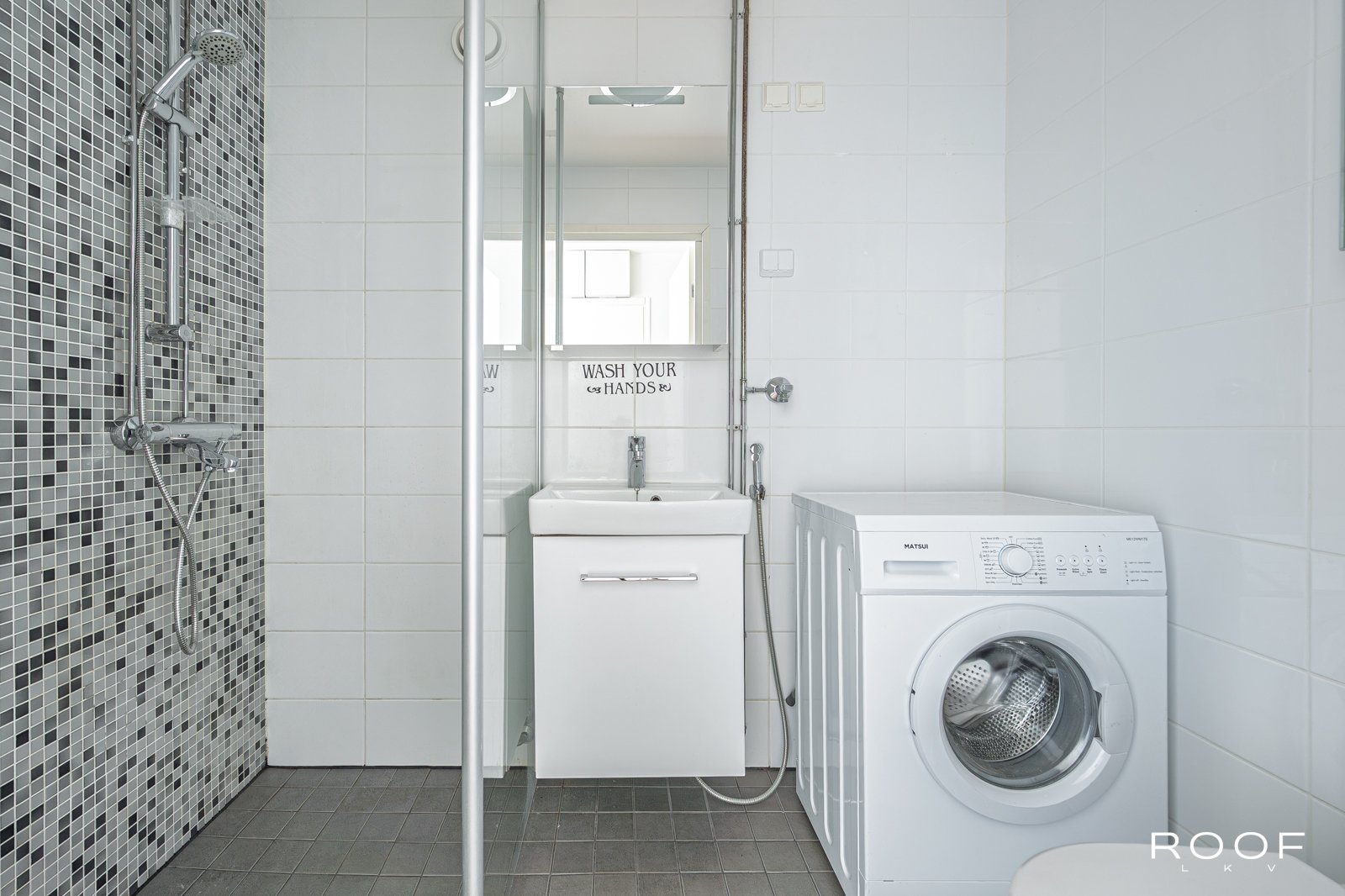 - WC-istuin, suihku, suihkuseinä, pesukoneliitäntä, allaskaappi, ja peilikaappi