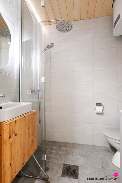 - WC-istuin, suihku, suihkuseinä, pesukoneliitäntä, lattialämmitys, peili, pesuallas, allaskaappi, bidee-suihku, ja tila pesutornille
