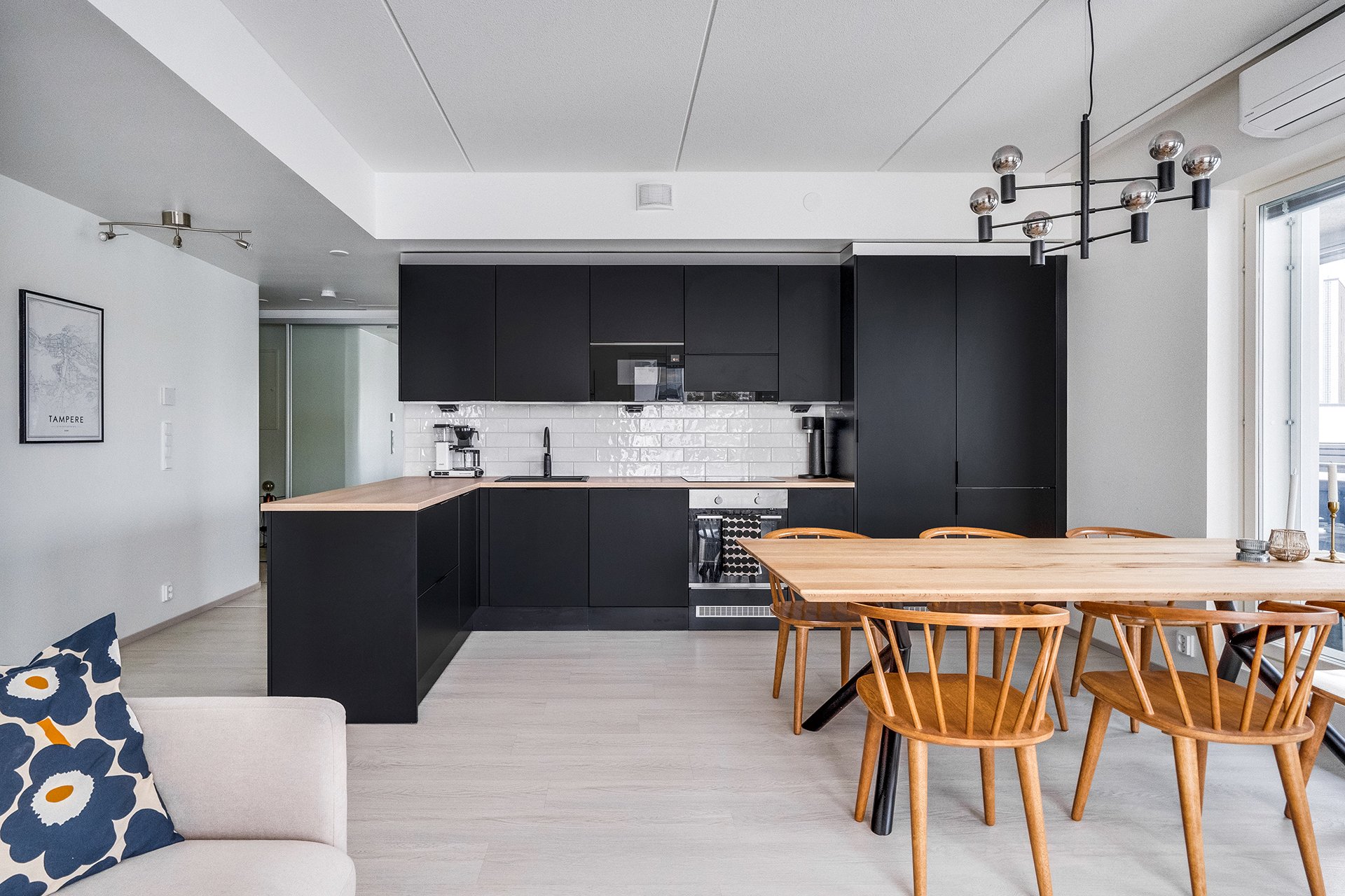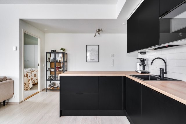 - Keittiössä paljon kaappi- ja laskutilaa. Keittiöön on asennettu niemeke rakennusvaiheessa. Keittiöön mahtuu suurempikin ruokailuryhmä. Lattia: vinyyli Seinät: maali, kaakeli Varustus: jääkaappi, puolikas pakastin, uuni, induktioliesi, mikroaaltouuni, liesituuletin.