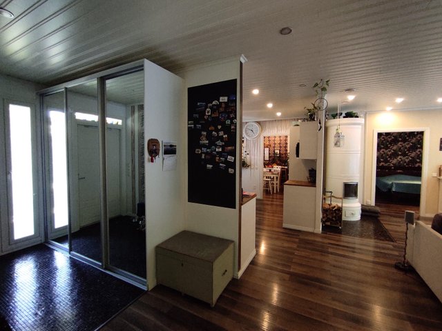 - Ruokailuhuone, suunniteltu makuuhuoneeksi mutta on nyt käytössä ruokailuhuoneena.