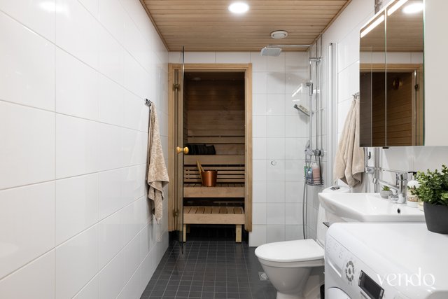 - Kylpyhuoneen varustuksena wc-istuin, suihku, suihkuseinä, pesukoneliitäntä, lattialämmitys, peilikaappi, kiinteät valaisimet, kylpyhuonekaapisto, bidee-suihku. Lattiapinnat laattaa, seinäpinnat kaakeloitu.
