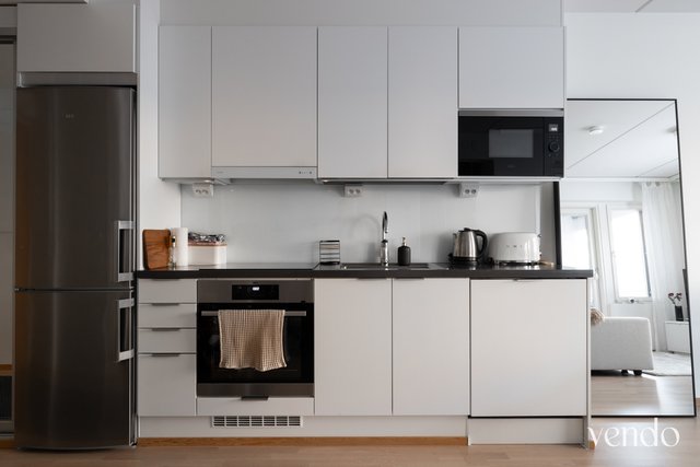- Keittiön varustuksena jääkaappipakastin, induktioliesi, erillisuuni, liesituuletin, mikroaaltouuni, astianpesukone, kiinteät valaisimet. Lattiapinnat parkettia, seinäpinnat maalattu ja osalaatoitettu.