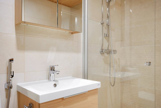 - Peilikaappi, allaskaappi, pesuallas, pyykkikaappi, suihku, pesukoneliitäntä, suihkuseinä, ja wc-istuin
