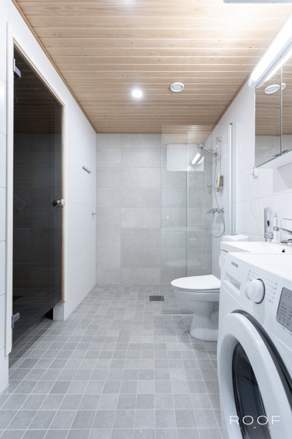- WC-istuin, suihku, suihkuseinä, allaskaappi, peilikaappi, lattialämmitys, pesukoneliitäntä, ja pesuallas