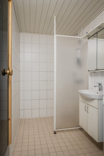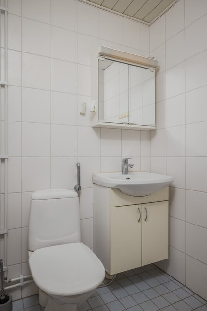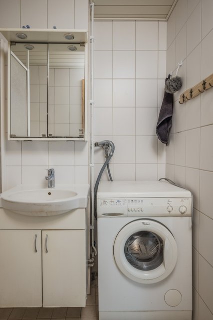 - Suihku, suihkuseinä, peilikaappi, pesuallas, allaskaappi, ja pesukoneliitäntä (mahtuu pesutorni)