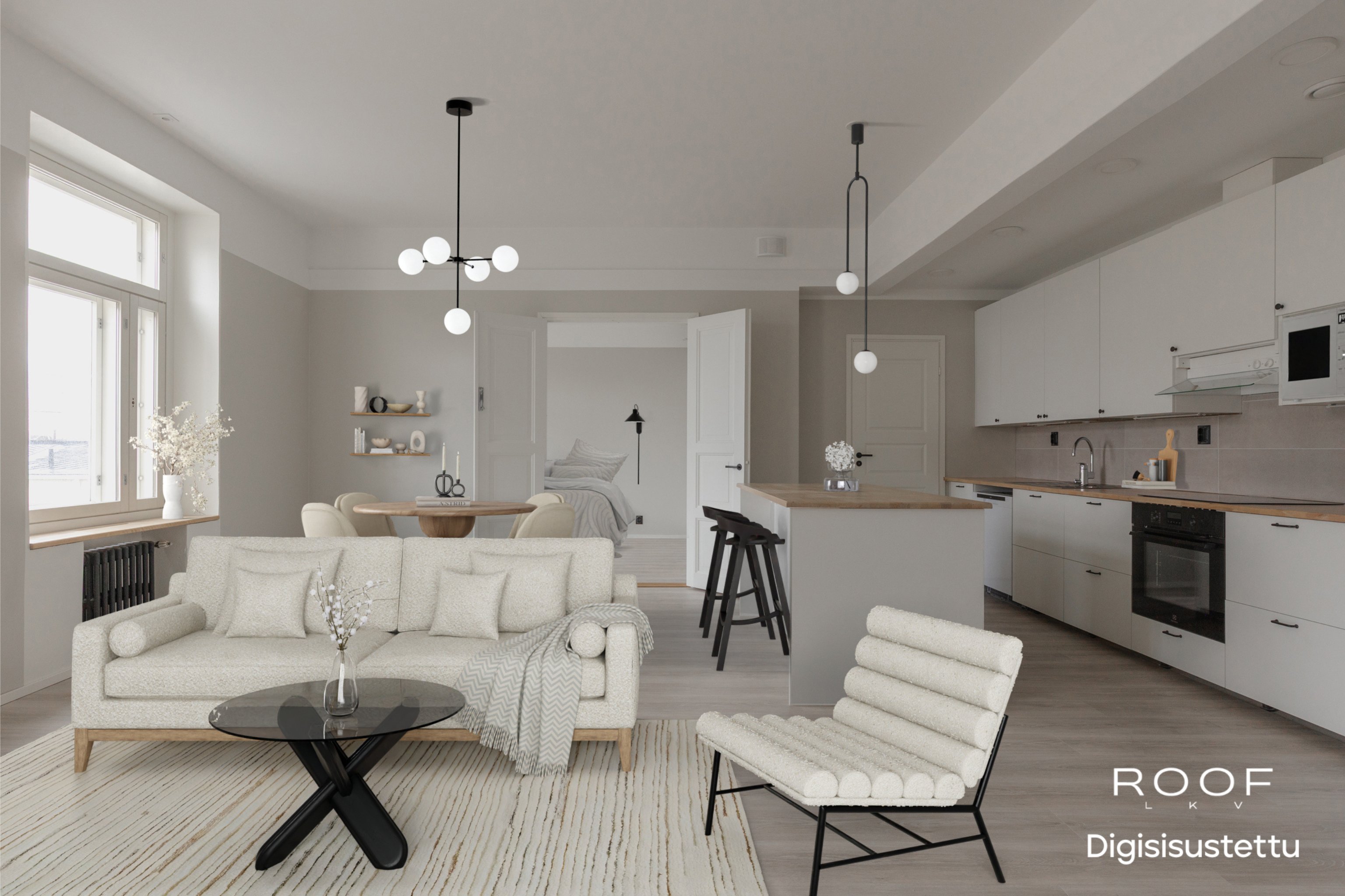 Asunto on täysin saneerattu kauttaaltaan ja remontti on tehty pieteetillä korkealuokkaisin materiaalein. Harmoninen väripaletti, laadukkaat pinnat ja valaistuksen harkittu suunnittelu luovat hienostuneen ja rauhallisen tunnelman.