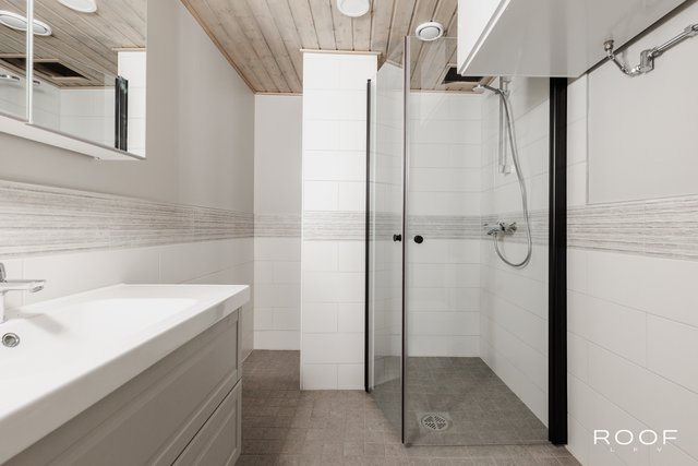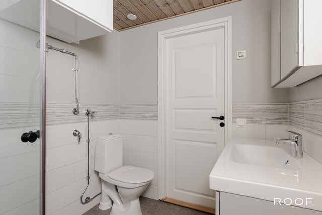 - WC-istuin, suihkuseinä, pesukoneliitäntä, pesuallas, allaskaappi, bidee-suihku, peili, ja suihku