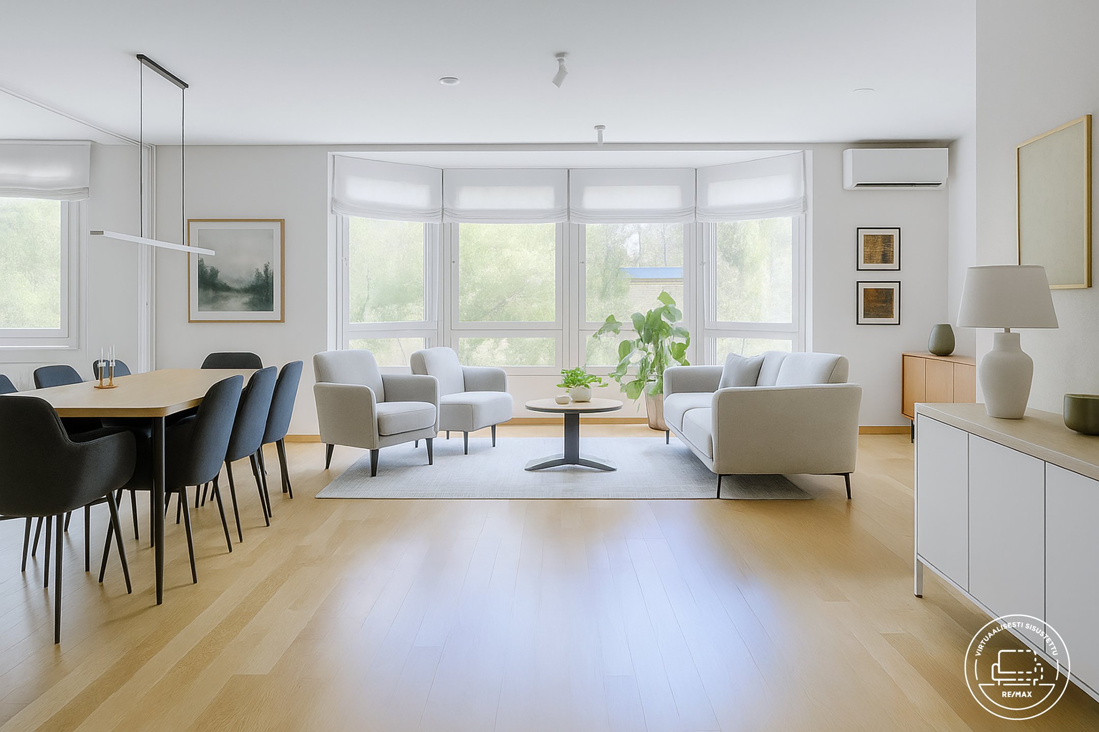 - Olohuoneen erkkeristä ikkunanäkymät pihalle lounaaseen, tilaa ruokapöydälle ja sohvaryhmälle. Seinät maalattu ja lattia parkettia.