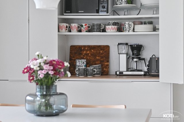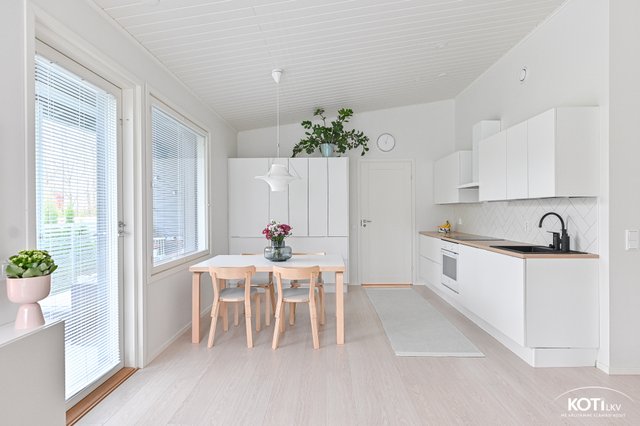 Laadukas ja trendikäs Puustelli -keittiö on kotikokkaajan unelma. Integroidut kodinkoneet ja paljon säilytystilaa, aamiaiskaappi tuo keittiöön käytännöllisyyttä ja pitää yleisilmeen aina siistinä. Ruokailutilaan mahtuu vaivatta suurempikin ruokaryhmä.