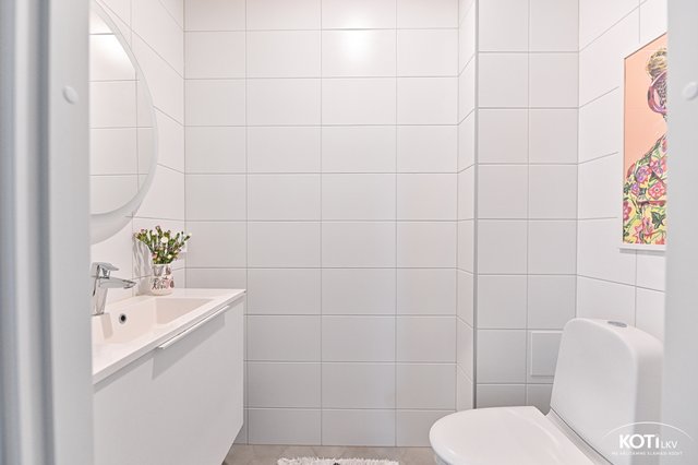 - Erillisessä wc:ssä valopeili, leveä allaskaappi, wc-istuin, bide-suihku, kokonaan laatoitettu.