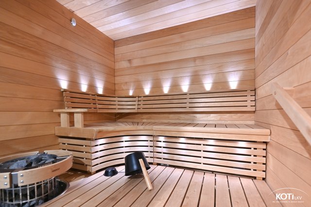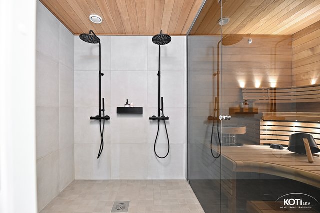 - Tunnelmallinen sauna jossa muotolauteet. Harvian pilarikiuas, lasiseinä kylpyhuoneeseen. Saunassa kaiutimet bluetooth yhteydellä ja kulku vilvoittelemaan lasitetulle terasille kodinhoitohuoneen kautta.