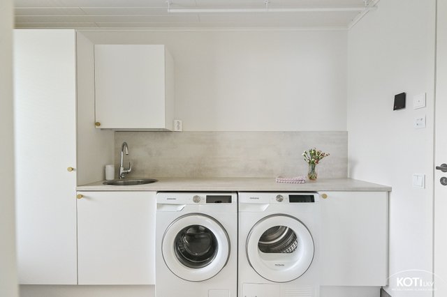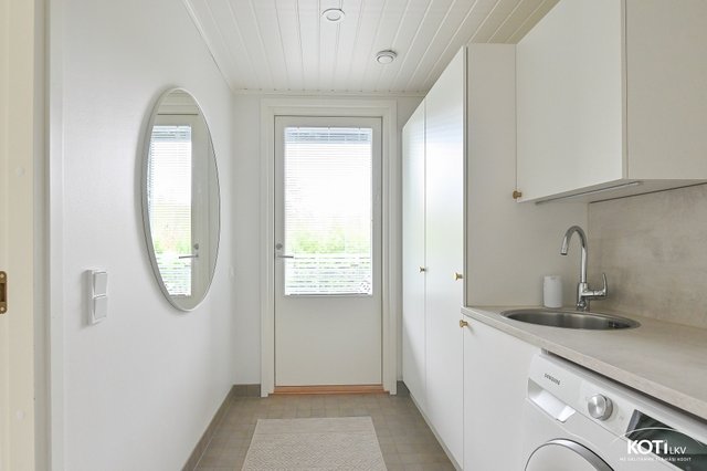 - Todella tilava kodinhoitohuone jossa Puustellin kiintokalusteet. Runsaasti säilytystilaa, allas, lattia laatoitettu, paikat pesukoneelle ja kuivausrummulle. Kulku lasitetulle terassille ja pihalle.