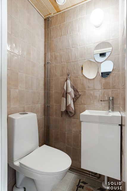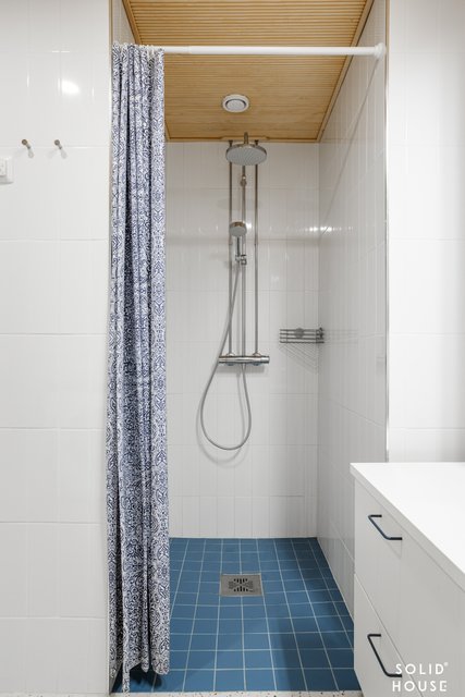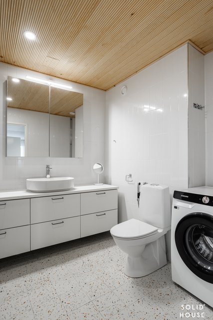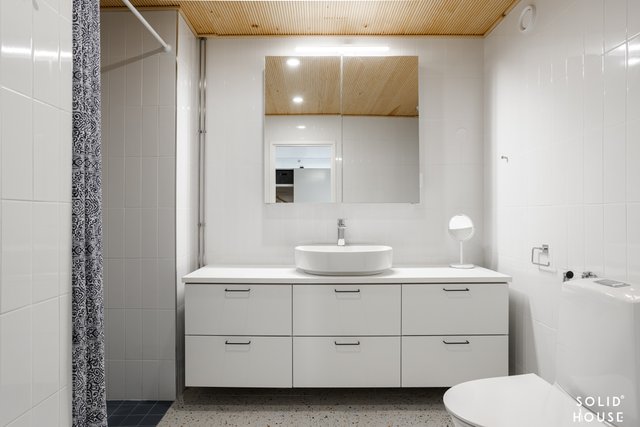 - WC-istuin, pesukoneliitäntä, lattialämmitys, peilikaappi, pesuallas, allaslaatikostot, ja suihku