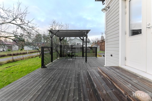 På den lummiga tomten finns äppelträd och bärbuskar. Den rymliga terrassen ger möjlighet att njuta av vackra sommardagar. Huset ligger på egen tomt, och dess läge nära havet och skolor gör det idealiskt för familjer.