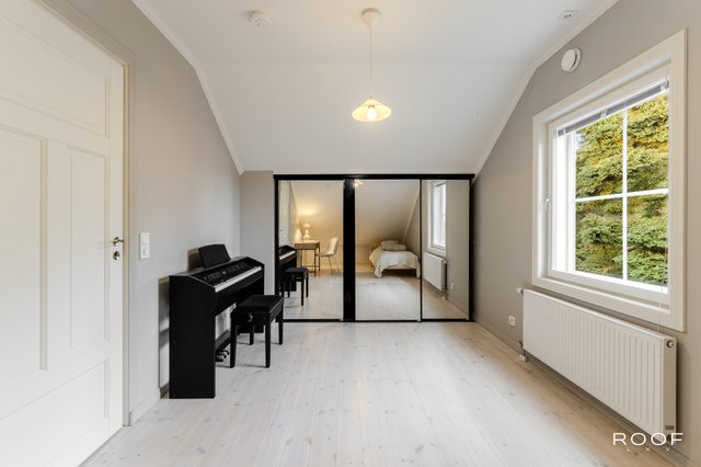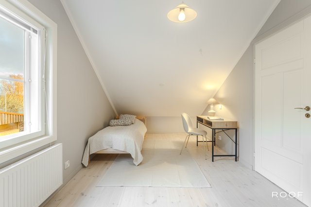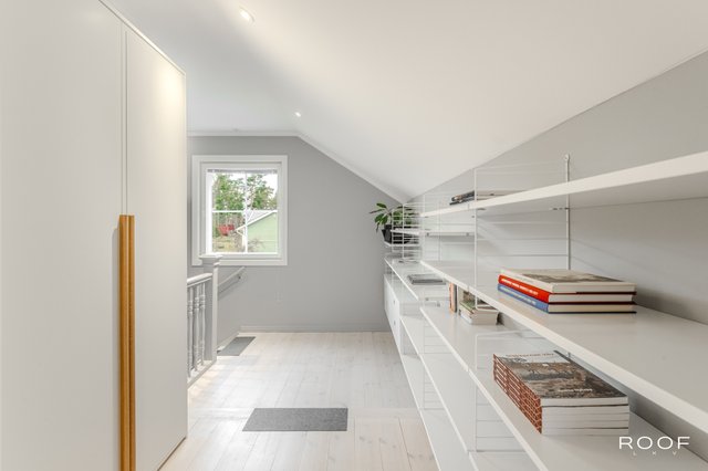 - Molemmissa makuuhuoneissa vaatekomerot. Yläkerran aulassa oleva String-hylly kuuluu kauppaan. Talon alla pieni kellaritila.