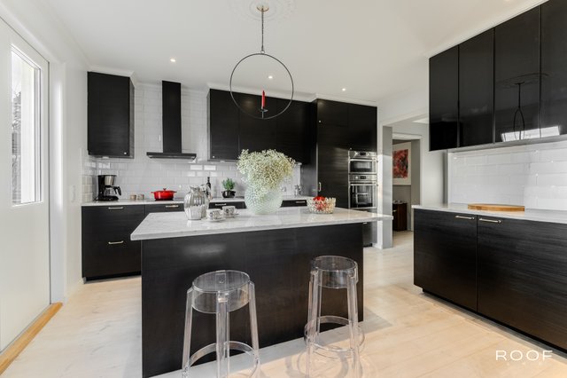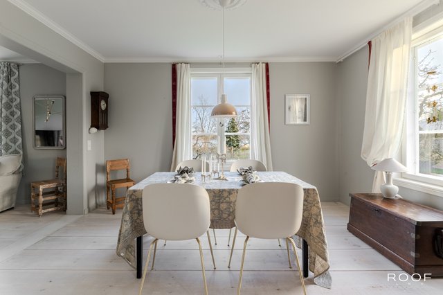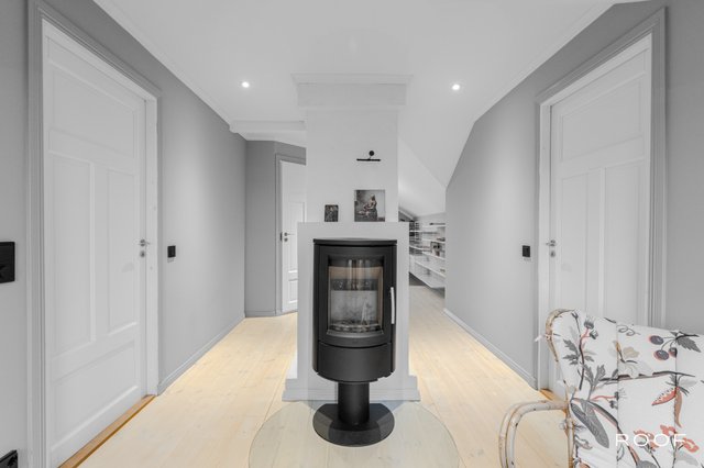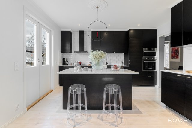 Köket är modernt, stilrent och välutrustat, med bland annat köksö och marmorytor. Huset har i huvudsak trägolv och i vardagsrummet och matsalen finns robusta plankgolv.