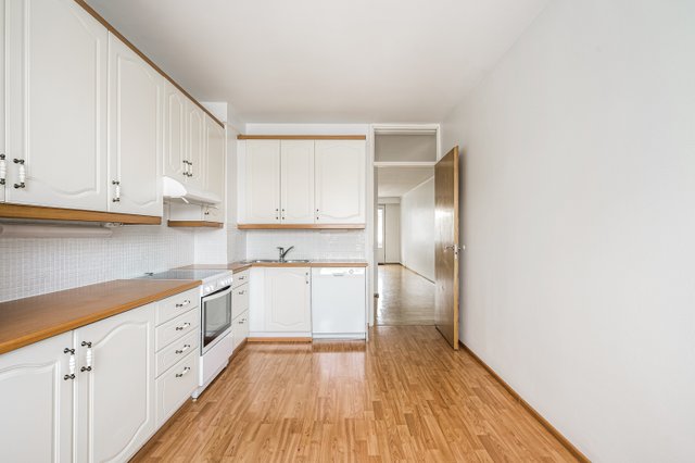 Asunnon tilava olohuone avautuu parvekkeelle, jossa voit nauttia aamukahvit tai rentoutua iltaisin. Erillinen keittiö on käytännöllinen ja sinne mahtuu mukavasti ruokapöytä.
