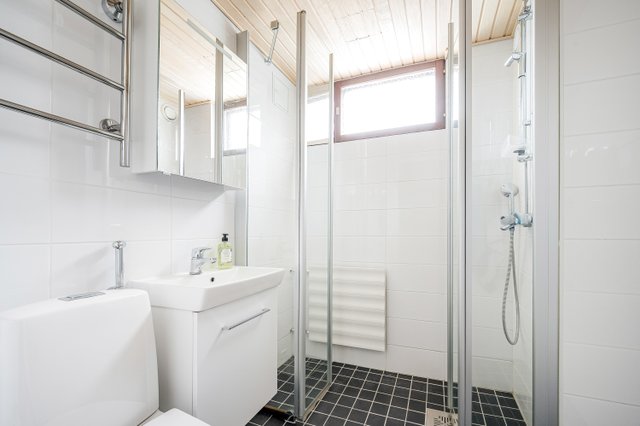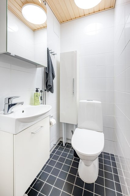 - WC-istuin, suihku, lattialämmitys, pesukoneliitäntä, suihkuseinä, peilikaappi, ja allaskaappi