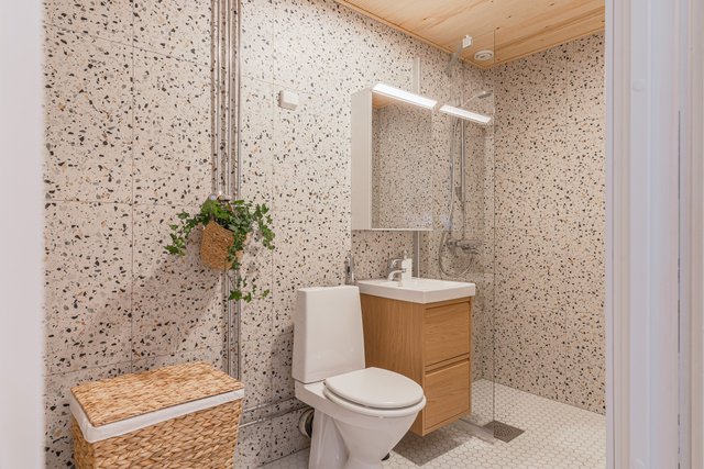 - Pesukoneliitäntä, lattialämmitys, peilikaappi, pesuallas, allaskaappi, bidee-suihku, wc-istuin, suihku, ja suihkuseinä
