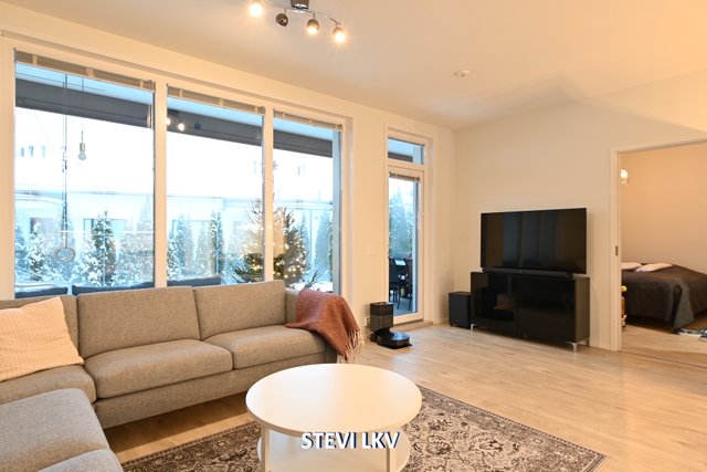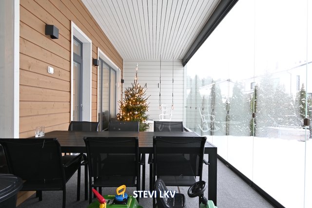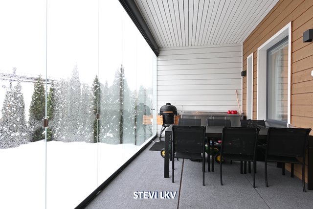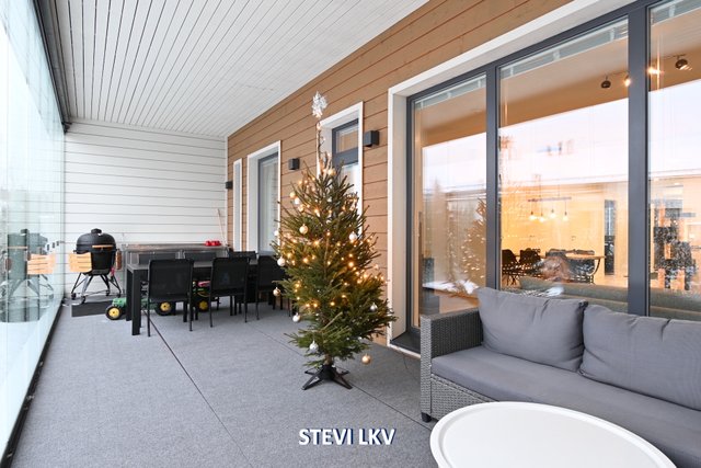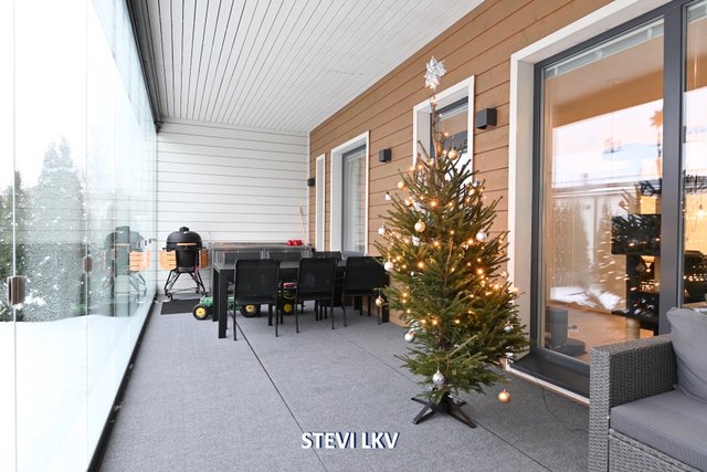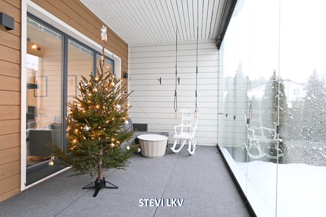 Asunnon viilennykseen on ilmalämpöpumppu. Lasitettu terassi tarjoaa mukavan lisähuoneen ja pääsee hyvin grillailemaan.