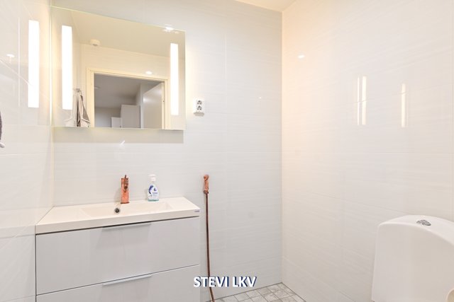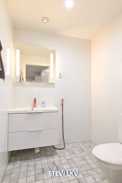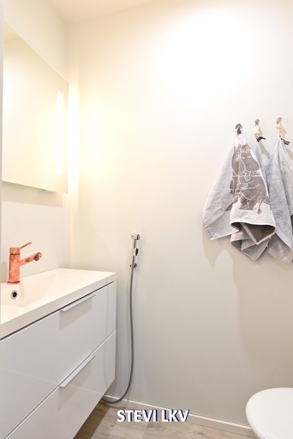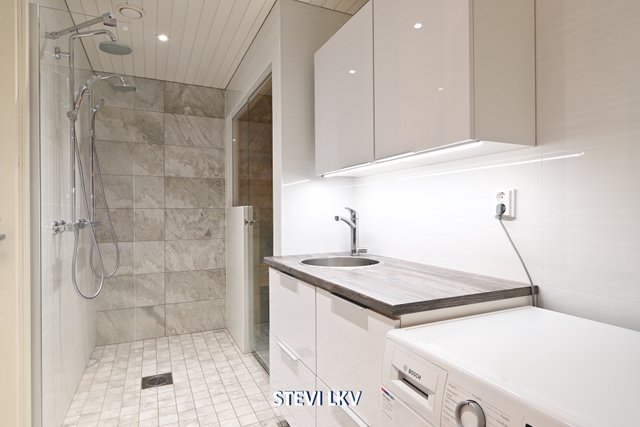 - Suihku (Tuplasuihkut), suihkuseinä, pesukoneliitäntä, lattialämmitys, ja pesuallas