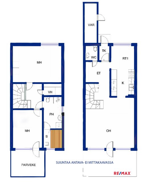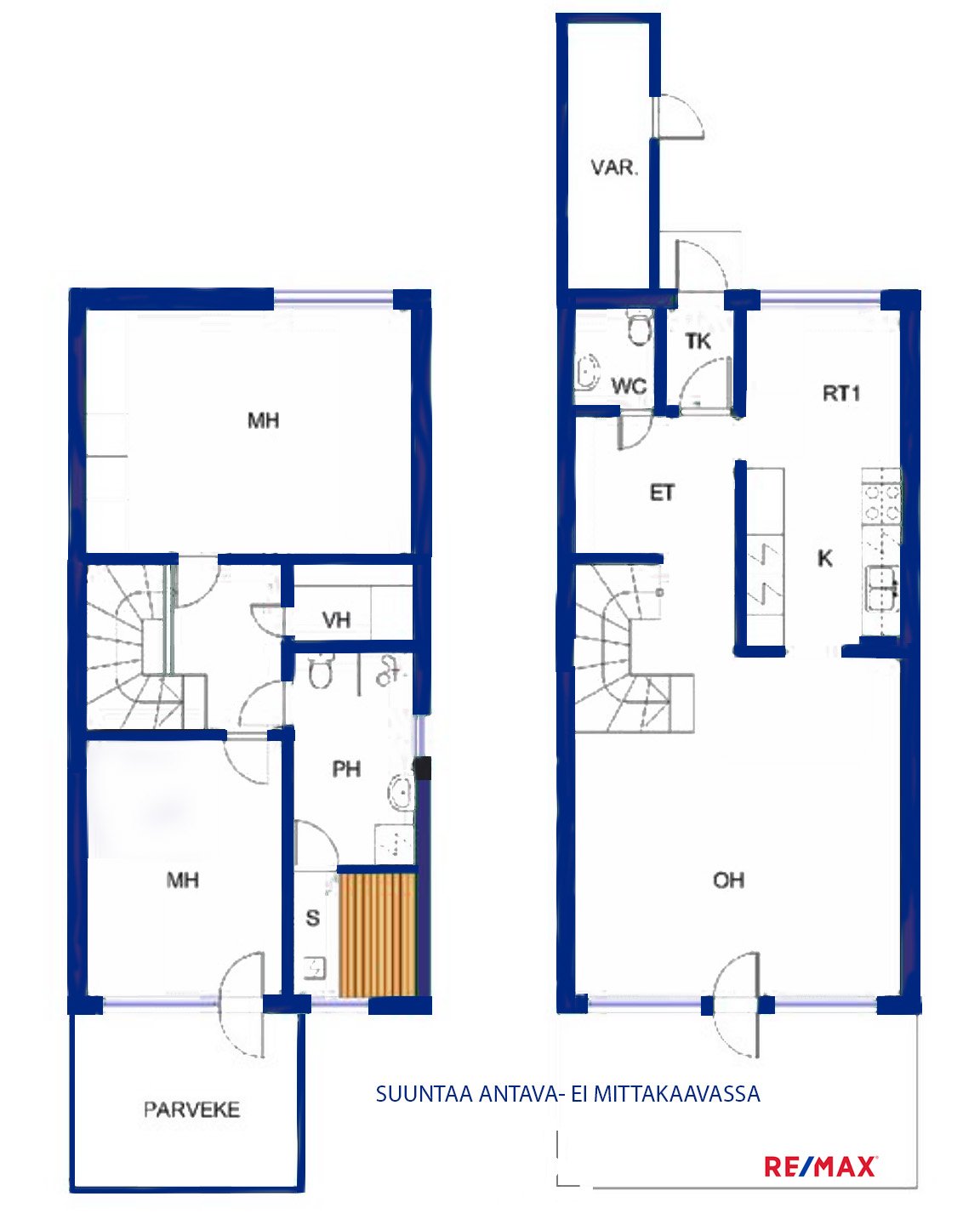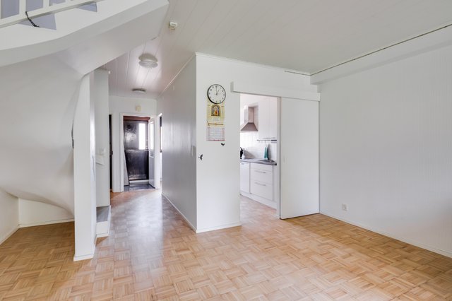 - Alakerrassa mosaiikkiparketti, portaikossa ja yläkerrassa vinyylilankku. Kylpyhuoneessa keraaminen laatta.