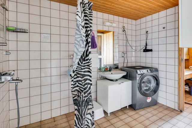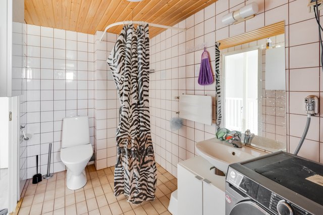 - Seinäpinnat huonetiloissa maalattu, kylpyhuoneessa kaakeloitu ja saunassa puupaneli