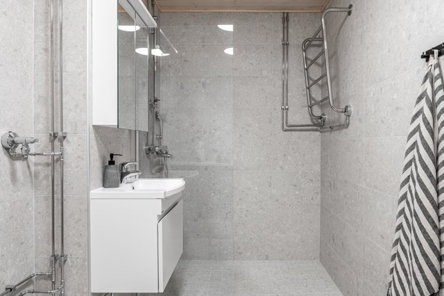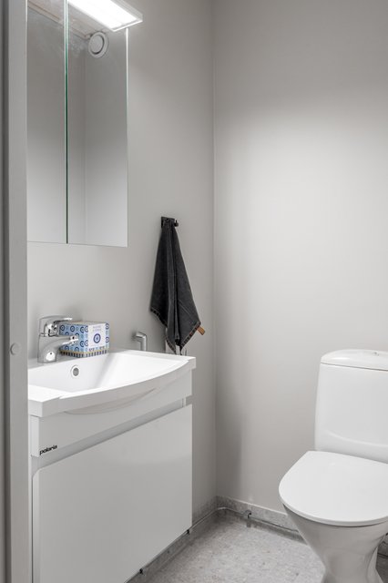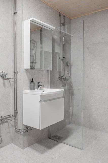 - Suihku, suihkuseinä, allaskaappi, peilikaappi, pesukoneliitäntä, lattialämmitys, ja pyyhekuivain