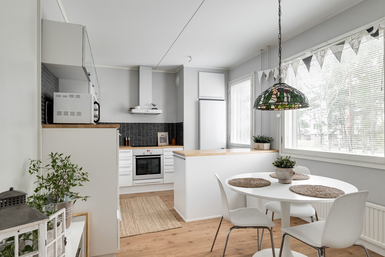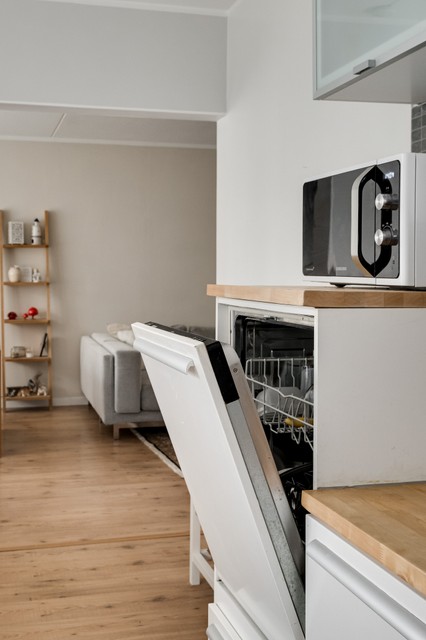 - Keittiön varustukseen kuuluu induktioliesitaso, erillisuuni (2024), liesituuletin (aktiivihiili), jääkaappi/pakastin (2020) ja astianpesukone (2023). Keittiön lattia on laminaattia, työtasot puuta, kaapistojen välitila on kaakelia. Seinät on maalattu. Tiskiallas on uusittu vuonna 2023.