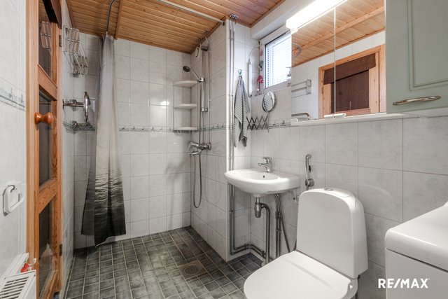 - Suihku, pesukoneliitäntä, lattialämmitys, peilikaappi, bidee-suihku, pesuallas, ja wc-istuin