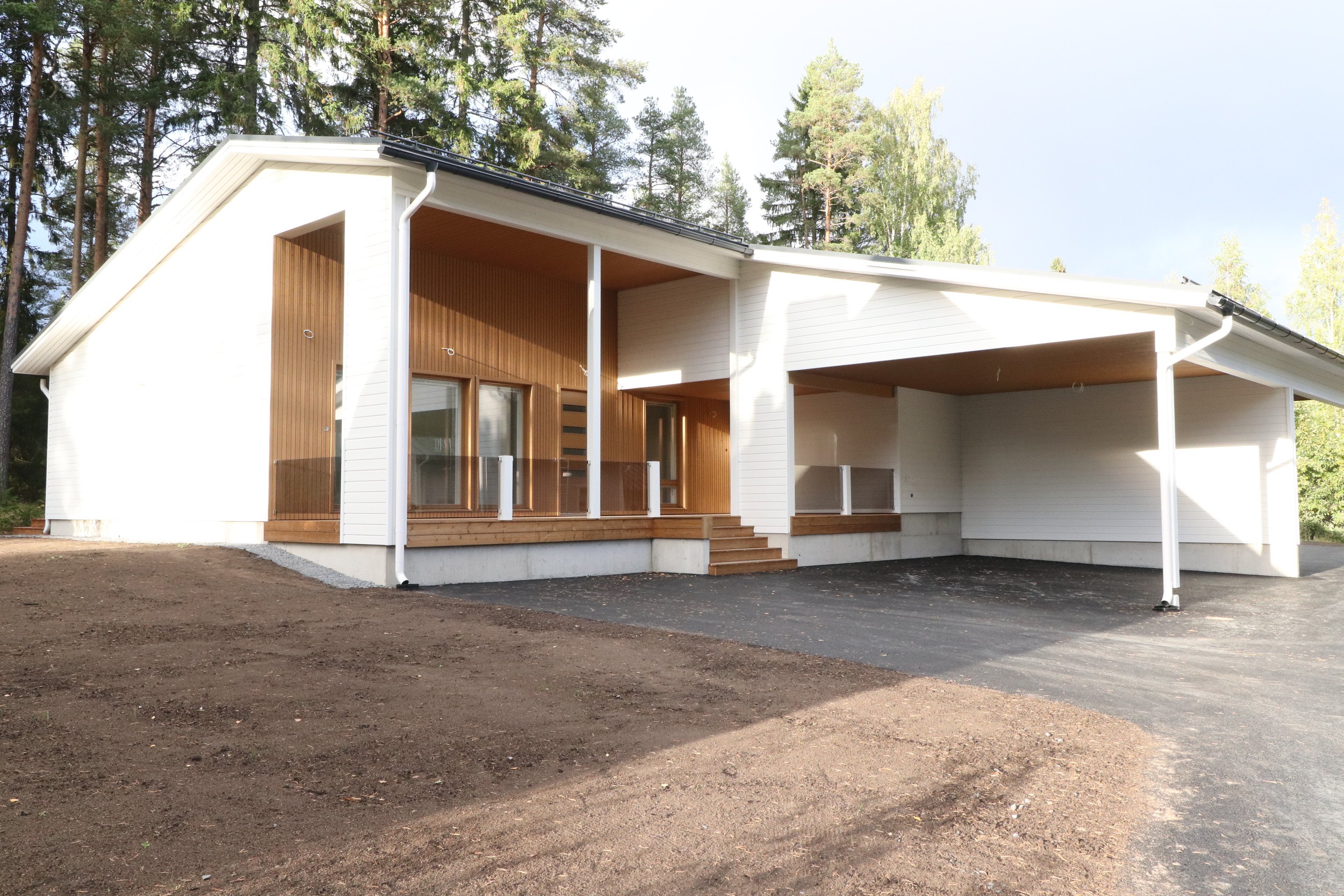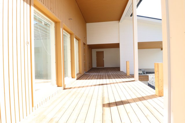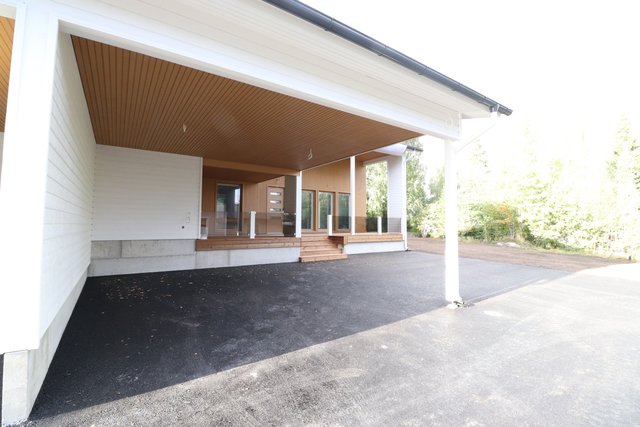 Katettu tilava terassi antaa suojan sateella ja liialta auringolta.
