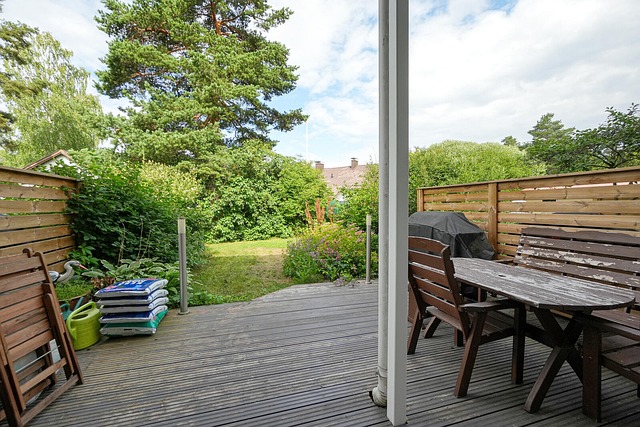 Rauhallinen iso takapiha omalla terassilla, tilava parveke.