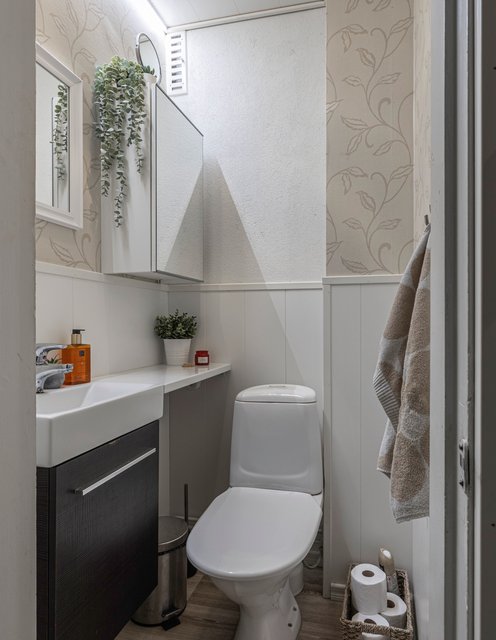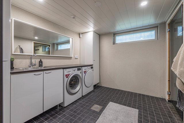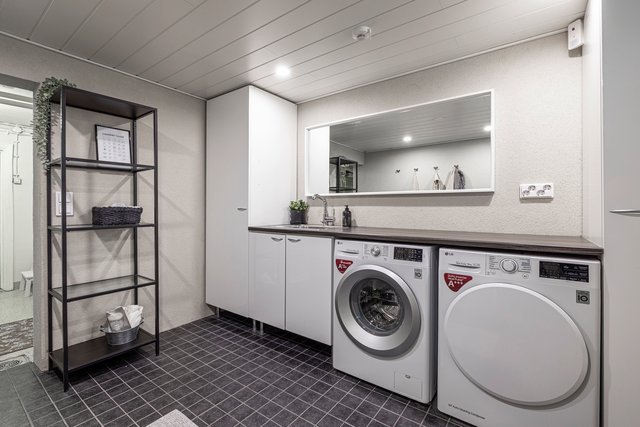 - Pesukoneliitäntä, lattialämmitys, pesuallas, lattiakaivo, ja pöytätaso