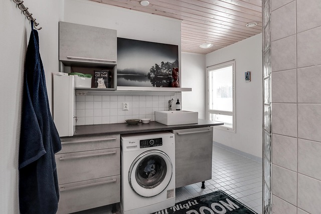 - Pesukoneliitäntä, lattialämmitys, pyykkikaapit, lattiakaivo, ja pöytätaso