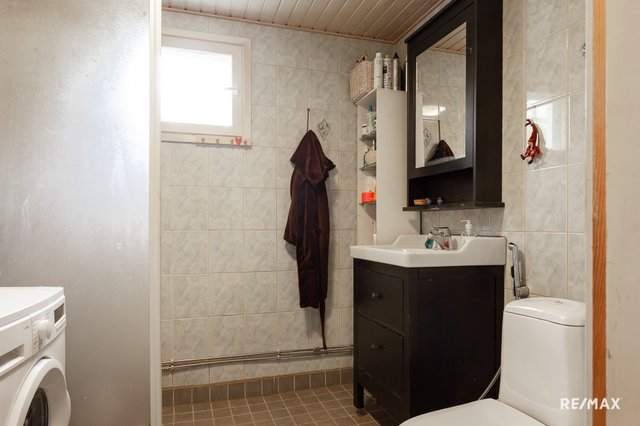 - WC-istuin, suihku, suihkuseinä, pesukoneliitäntä, lattialämmitys, peili, pesuallas, allaskaappi, ja bidee-suihku