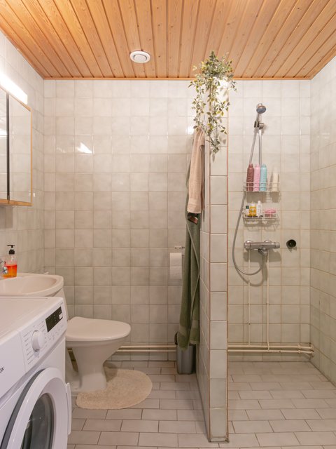 - WC-istuin, suihku, suihkuseinä, lattialämmitys, peilikaappi, pesuallas, bidee-suihku, ja pesukoneliitäntä