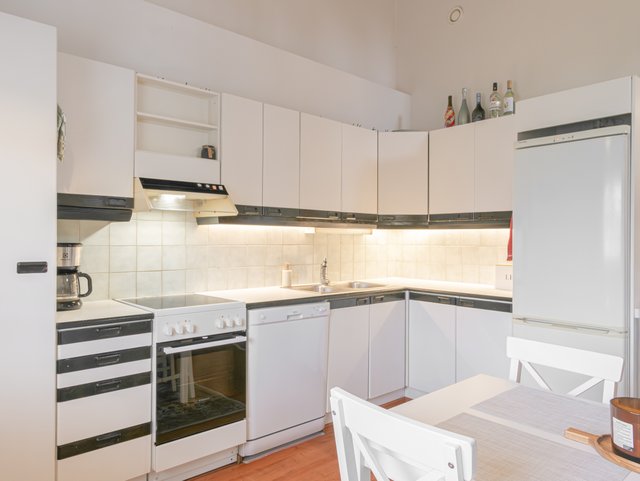 - Liesi (Rosenlew, keraaminen), jääkaappipakastin (Helkama, valkoinen), astianpesukone (Upo, valkoinen), ja liesituuletin