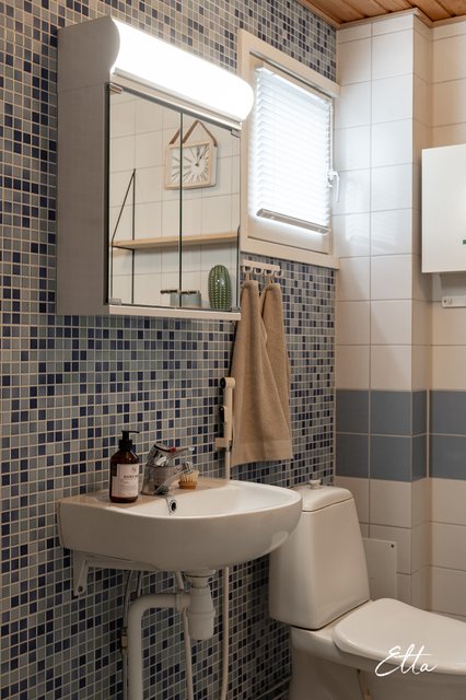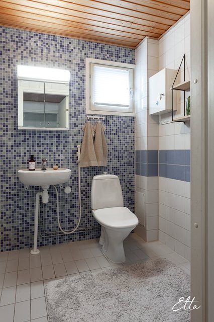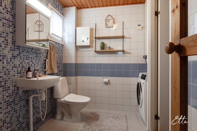 - WC-istuin, suihku, pesukoneliitäntä, lattialämmitys, peilikaappi, ja bidee-suihku
