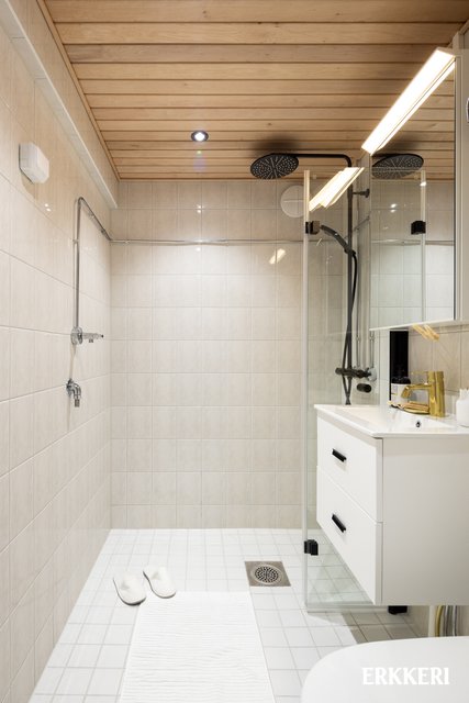 Tilava ja siisti kylpyhuone täydentää kokonaisuuden, tarjoten käytännöllisyyttä ja mukavuutta arjen hetkiin.